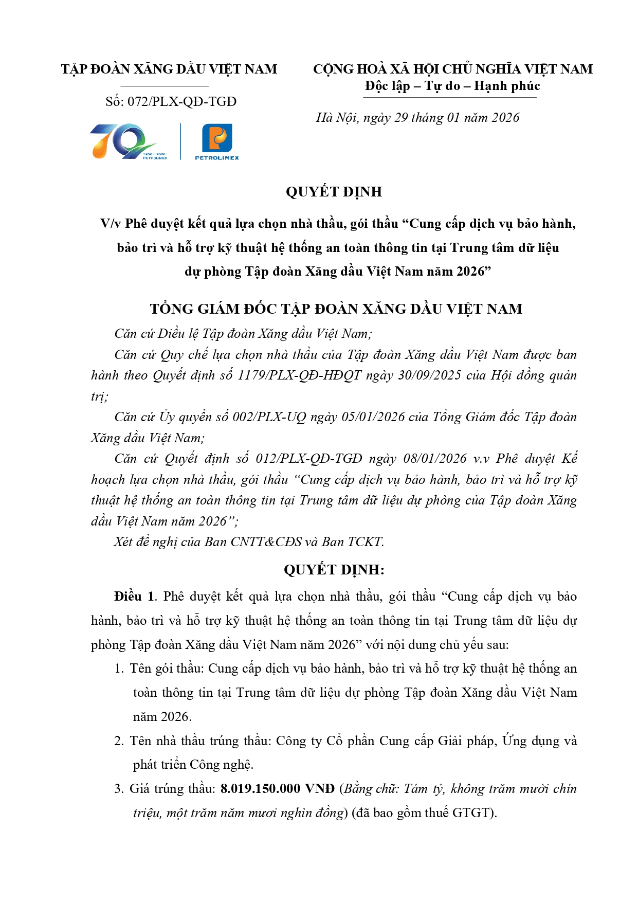 Quyết định phê duyệt kết quả lựa chọn nhà thầu, gói thầu “Cung cấp dịch vụ bảo hành, bảo trì và hỗ trợ kỹ thuật hệ thống an toàn thông tin tại Trung tâm dữ liệu dự phòng Tập đoàn Xăng dầu Việt Nam năm 2026”